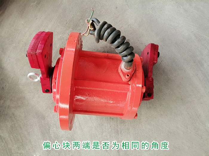 拆除倉(cāng)壁振動(dòng)器振動(dòng)電機(jī)防護(hù)罩后旋松外側(cè)偏心塊,加緊螺栓使兩側(cè)偏心塊向同方向轉(zhuǎn)動(dòng),使電機(jī)軸上的上刻線(xiàn)對(duì)準(zhǔn)偏心塊激振力示值線(xiàn)至需要的數(shù)值處,并檢查偏心塊兩端是否為相同的角度。