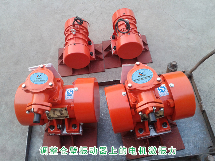 調(diào)整倉壁振動器上的電機激振力,將振動電機兩端軸上的偏心塊調(diào)整為同一個方向相同的角度。首先拆除防護罩然后旋松外側(cè)偏心塊加緊螺栓將兩側(cè)偏心塊應(yīng)同方向轉(zhuǎn)動到所需要的激振力示值線即可。